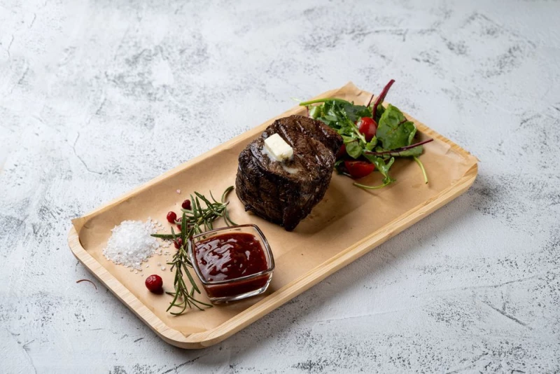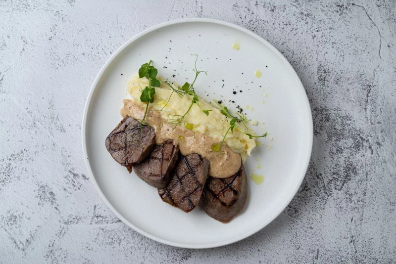 Медальоны из свинины с кунжутным соусом и чипсами из пармезана